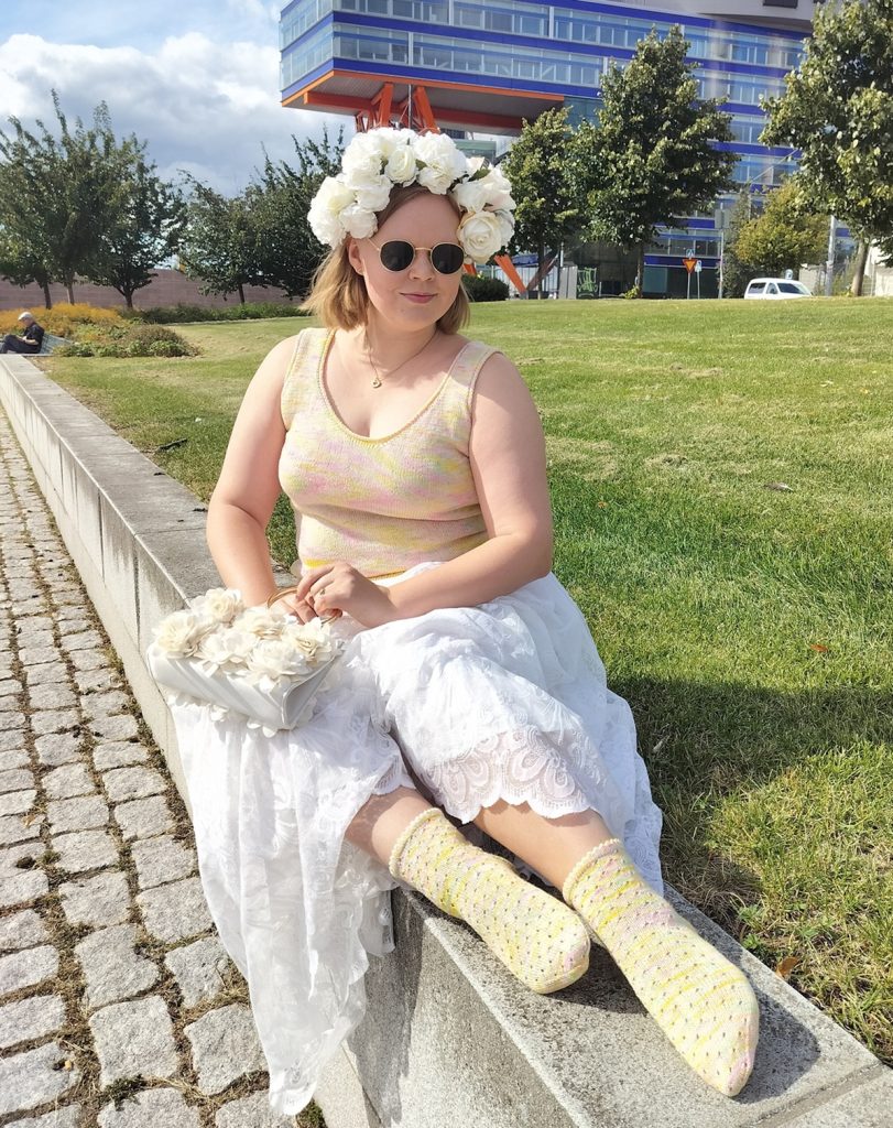 Viimeisin mallini on Riemu-toppi ja -sukat <3 Ne neulotaan ohuesta merinovillasta, jonka paksuus on n. 400 m / 100 g. Kuvan neuleiden ihananväriset langat ovat Kettu yarns:in Janan padoista! Langan nimi on Everyday sock merino ja tämä hurmaava väri on nimeltään Spring unicorn. Toppi on mukava käytössä ja sopii monenlaiseen menoon! Kokoja on paljon, isoimmassa vyötärönympärys 143 cm. Sukissa on koot 38-41. Kuvan Riemu-topissa on sileä pinta ja rullareunat. Mallissa on toisena vaihtoehtona pitsipinta ja pykäreunat. Setin vaikeus on keskitasoa: jos olet aiemmin neulonut sukan, onnistut näissä varmasti!