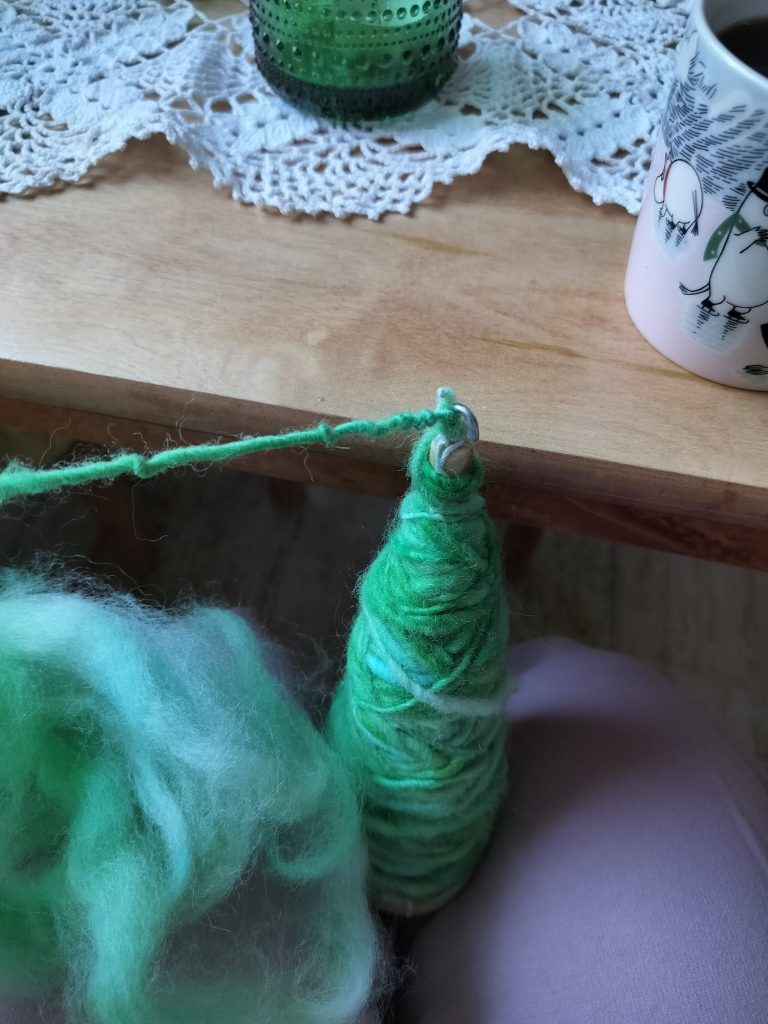 Aloitin itse kehräämisen vihreällä, Adelia fibersin värjäämällä suomalaisella kampatopsilla. Tätä villaa oli helppoa käsitellä!