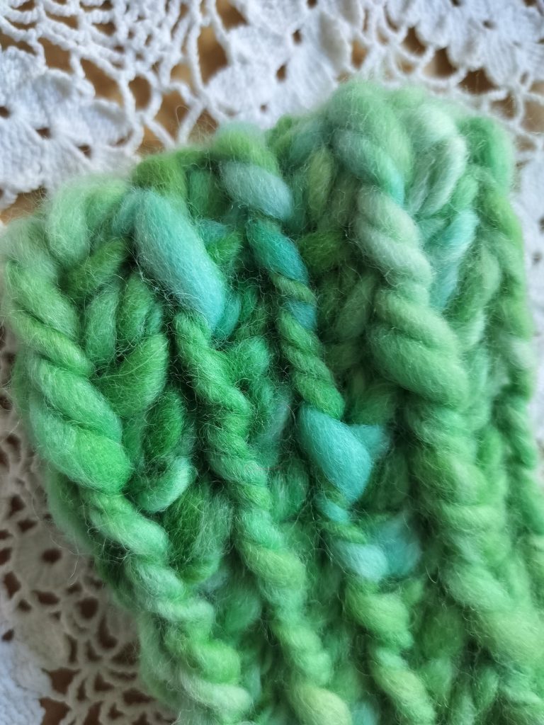 Vihreä, värttinällä käsin kehrätty lanka, suomalainen villa