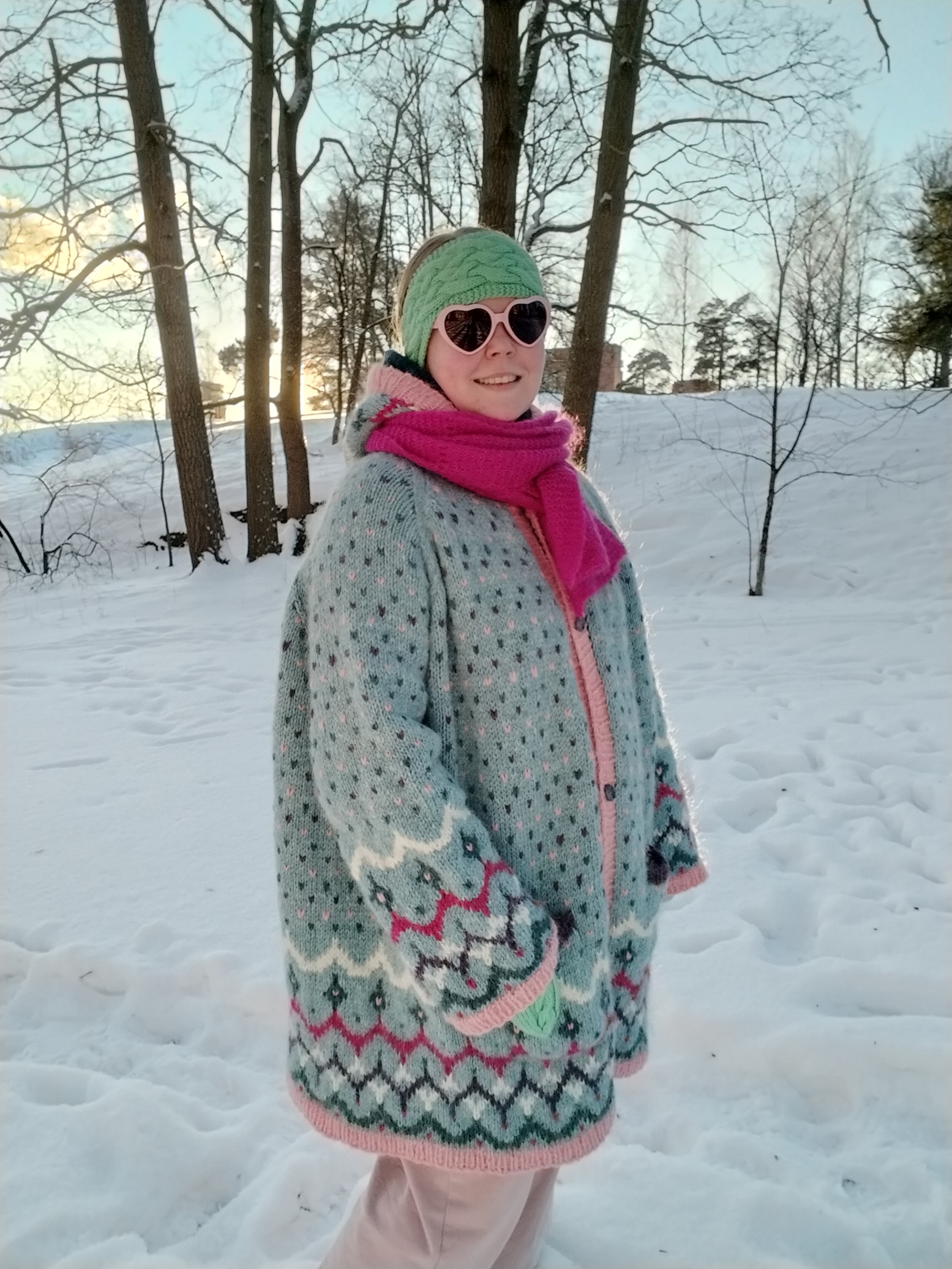 Pastellisävyinen Kuura-takki lumisessa Helsingissä, Kampin vieressä. Lanka islantilaista villaa, Alafosslopia.