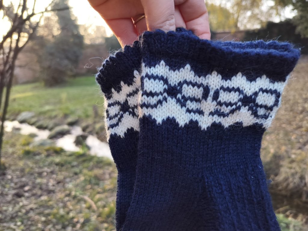 Suomalaisesta, käsinvärjätystä villasukkalangasta neulotut kirjoneulesukat.