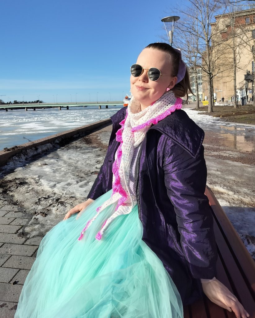 Lanka: mikä vain! Mallihuivi on Lucky omen yarns:in Alpakkaa värissä Jääprinsessa ja Merinosukkaa värissä Pinky. Nämä ovat fingering-paksuisia (100 g = n. 400 m), jolloin 2 m huiviin tarvitaan n. 100 g huivilankaa ja rimpsuun 30-40 g. Paksummista langoista neulottaessa langanmenekki kasvaa. Ohjeessa neuvotaan, kuinka huivin kokoa ja lankaa voi muokata ja kuinka langan saa riittämään koko huiviin!